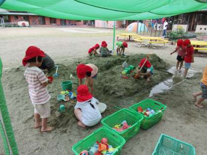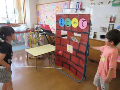 今日はマリオワールドに新しい遊びのマリオの的当てが登場しました。ピーチ姫やマリオの的に球を投げる遊びです。遊びながらルールを決めました。年長になると自分たちで友達と考えを出し合い、遊びを進めることができるようになってきています。