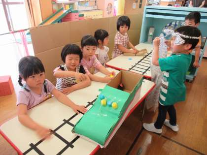 今日は年中組の友達とお互いの遊び場で遊びました。先週遊んだ年中組の遊びが、少し変わっていて「先生、たんぽぽ組のお化け屋敷、中が迷路みたくなっていたよ」「はま寿司がオープンスペースに移動して、たくさんのお客さんが入れるようになったよ」と嬉しそうに教えてくれました。