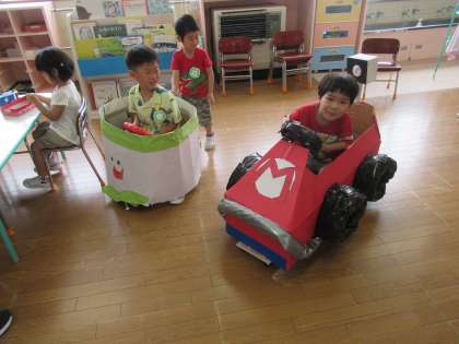 今日は壊れていたコクッパの乗り物(クッパクラウン)の修理が終わり、朝からみんなで交代して乗っていました。つばめ組さんのマリオカートを見て、動くのをつくりたい!と取り組んでいたマリオカートもみんなで順番に乗って遊びました。つばめ組さんのマリオワールドが面白く、何度も繰り返し遊びに行っていた子供たちです。