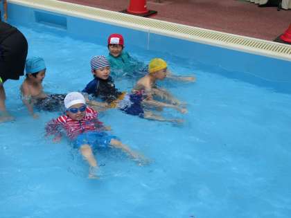 今日はプールに入って遊びました。「キャー気持ちいい」と大はしゃぎのつばめ組さんでした。