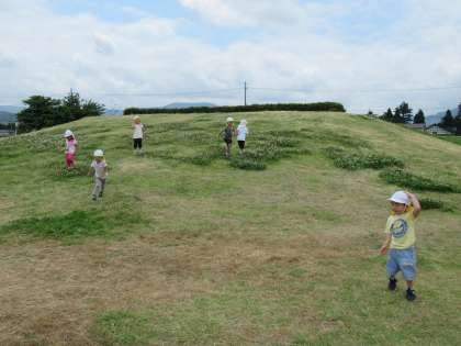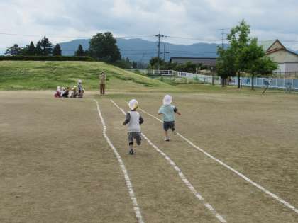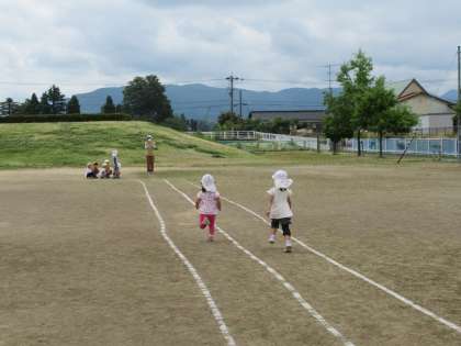 今日はピーターパン広場でかけっこをしました。「よーいどん!」の言葉と共にニコニコ笑顔で走る子供たち。走り終わると「もう1回!」の声が聞かれたので2回走りました。手を大きく振り、友達と楽しそうに走っていましたよ。