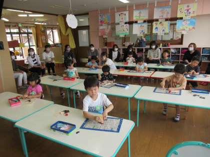 今日は子供たちが楽しみにしていた保育参観でした。朝の会の様子や歌、七夕製作を見てもらいました。歌はいつも以上に張り切って歌っていて、お家の方から拍手をもらって嬉しそうでしたね。七夕製作では、手順を理解して進めたり、ハサミを正しく使ったりしているかを見てもらいました。お母さんに見守られながら、かわいい織姫と彦星が完成しました。終わった子からマリオお化けサーキットやはま寿司でお家の方と一緒に遊びました。まだまだ遊びたかった様子の子供たちでしたが、自分たちのつくった遊びをお家の方に説明したり一緒に遊んだりできて喜んでいましたね。