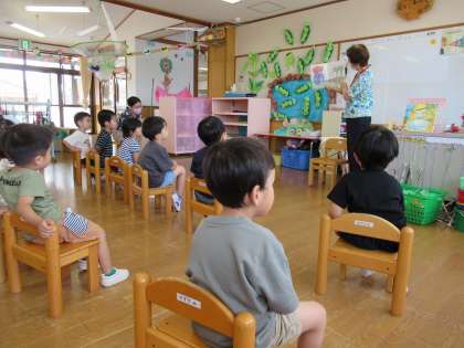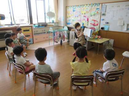 お話の会がありました。 公開日 2021/06/28 更新日 2021/06/28 1日の生活 6月28日(月) 今日はお話の会があり、たくさんのお話を読んでもらいました。 初めて見る絵本もあり、喜んで聞いていましたよ。