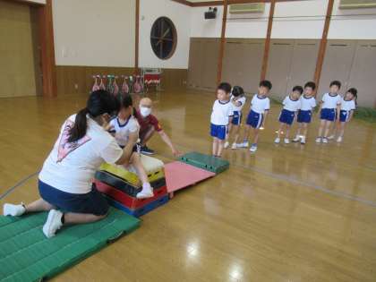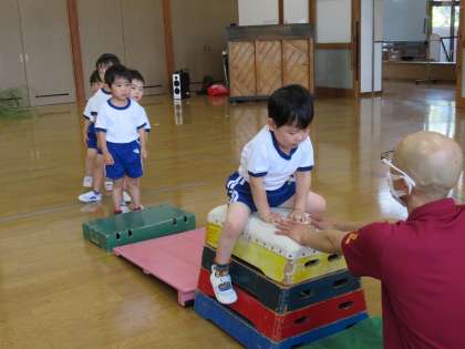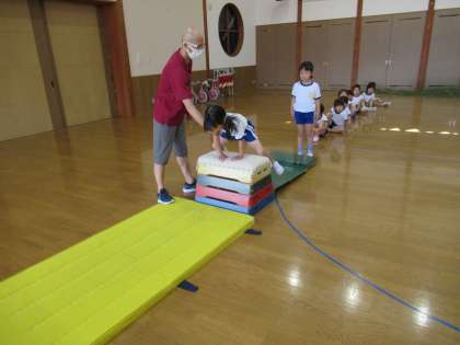 体操教室がありました 公開日 2021/06/28 更新日 2021/06/28 1日の生活 6月28日(月) 今日は体操教室がありました。新しく“おしりたんてい”の踊りを教えてもらったり、跳び箱をしたりしました。たくさん体を動かして、嬉しそうな子供たちでした。