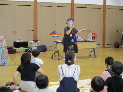 親子サークル 公開日 2021/06/29 更新日 2021/06/29 1日の生活 6月29日(火) 今日の親子サークルは、手品や腹話術、バルーンを見ました。手品では本物の生卵が目玉焼きに変わったり、スティックから花が出てきたりして、歓声が上がっていました。 腹話術では、サラちゃんと友達のジョージ君が手遊びの歌をうたったり、自己紹介をしたりしてくれました。
