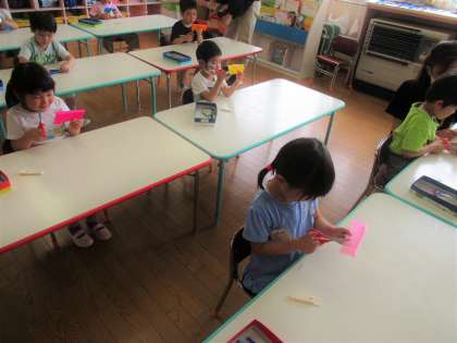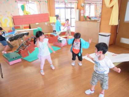 クラスではちょうちんの七夕製作をしました。午後からは遊んでいる途中で「エビカニクス踊りたい」と言い、何度も繰り返し踊り、汗だくになっていました。