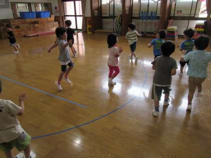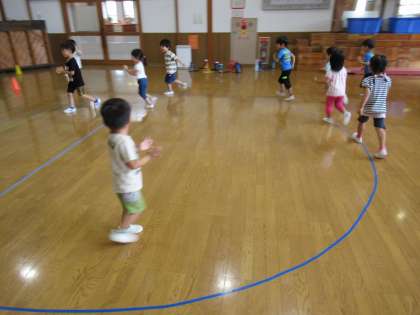 今日はプレイルームでロケットペンギンやエビカニクスを踊ったり、曲が止まったら自分の家に帰るという簡単なルールのある遊びをしたりしました。たくさん体を動かして気持ちのいい汗をかきましたよ。