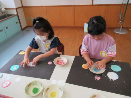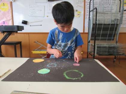 今日はプラネタリウムへ行った経験から宇宙をイメージしてブラシ絵やマーブリングで惑星をつくりました。最後に好きな形の星座をつくりました。ハートの星座や四角の星座など色々な星座ができあがりました。