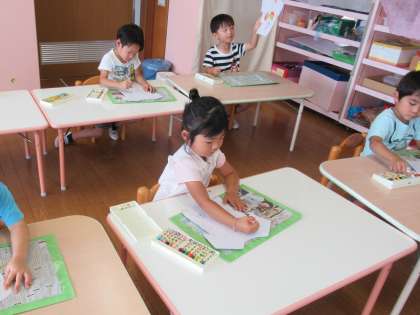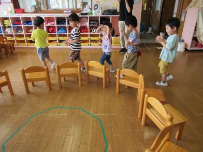 今日はクレヨンで絵を描いてTシャツをつくりました。絵具で色を付け可愛いTシャツができあがると嬉しそうに眺めていました。そして、今日も椅子取りゲームもしました。だんだんと上手になってきましたよ。