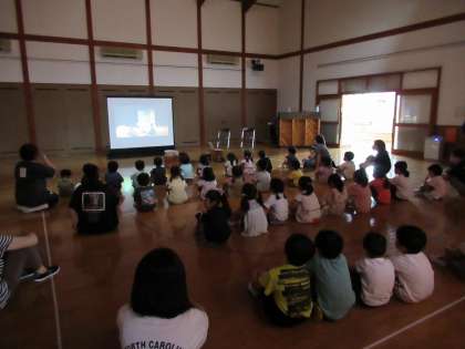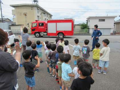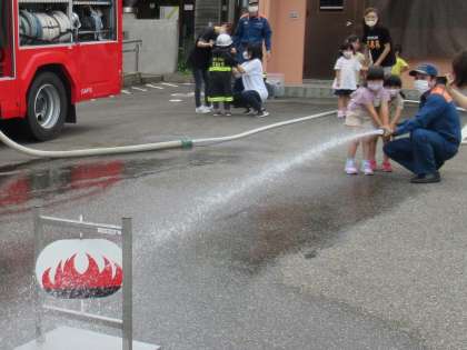 今日は防火教室がありました。DVDで地震の時の避難の仕方を見たり、放水体験をしたり、消防車の前で記念撮影をしたりしました。みんなとても嬉しそうでした。