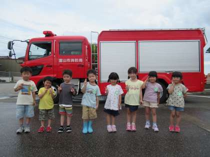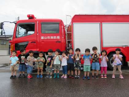 消防車と記念撮影をしました。みんな消防車に夢中でした。