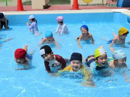 憧れの大きなプール!(ほし組) 公開日 2021/07/16 更新日 2021/07/16 1日の生活 7月15日(木) 今日は憧れだった大きなプールに入りました。雨が続いてなかなか大きなプールに入れなかったため、朝から嬉しそうな子供たち。ぐるぐると歩いたり、ワニさん歩きやカエルジャンプをしたり、宝拾いをしたりして遊びました。「プール楽しかったね!」とにこにこ笑顔で話していました。