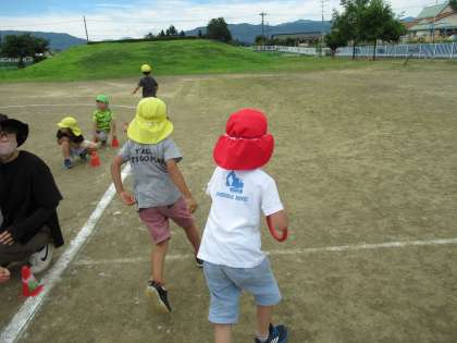 今日は保育所のお友達と交流保育があり、ピータパン広場でリレーをして遊びました。お互いにしている遊びなのですぐに打ち解けて楽しめました。