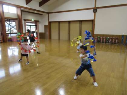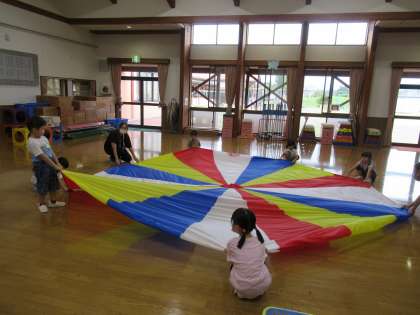 今日はプレイルームでフラフープやバルーンをしました。音楽に合わせて動かすことにも少しずつ慣れてきたようで、タイミングが分かるようになってきましたよ。