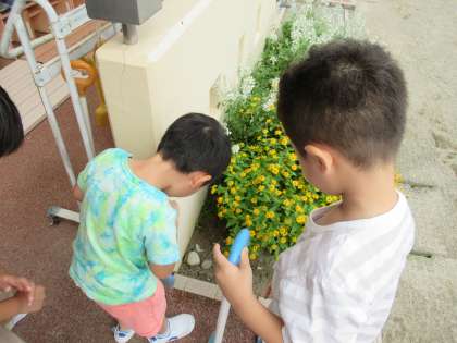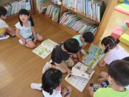カマキリを見つけたよ!(たんぽぽ組) 公開日 2021/09/15 更新日 2021/09/15 1日の生活 9月14日(火) 今日は園長先生が園内でカマキリを見つけ、見せてくれました。みんなでカゴの中に入れて「どうする?」「何食べるのかな?」「調べてみようか」とみんなで図鑑で調べてみると“いろいろな昆虫”と書いてあり、虫探しをしましたが、なかなか見つけられず…。明日はピーターパン広場に虫アミを持っていこう!と話していた子供たちです。