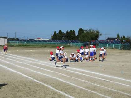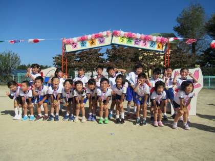 かけっこの後はリレーをしました。今日の勝負は白チームが勝ちました。赤チームさんも最後まで力いっぱい頑張っていました。最後に園長先生からメダルをいただき入場門で記念写真を撮りました。