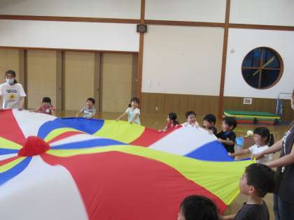 午後からは運動会のリズムをしました。ほし組さんが見に来てくれ「きれいだった」「一緒にやりたい」と言われ、ほし組さんと一緒にバルーンで遊びました。大勢ですると楽しさも倍増で、とても嬉しそうな子供たちでした。
