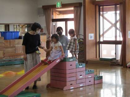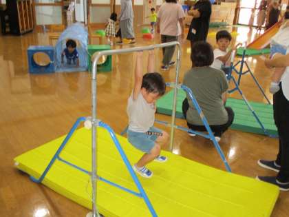 今日は久しぶりの親子サークルでした。プレイルームに鉄棒やトンネル、滑り台などを出してサーキット遊びをしました。元気いっぱいみんなで遊びましたね。