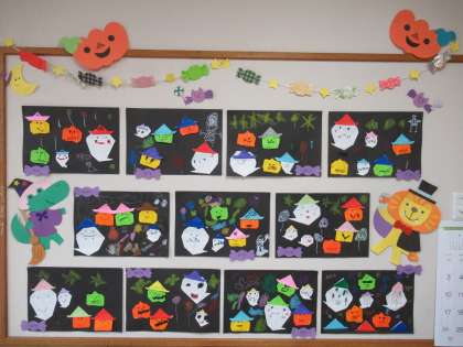 クラスの壁面はハロウィンになりました。みんなで折り紙でカボチャとお化け、帽子を折ってつくりました。