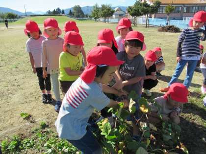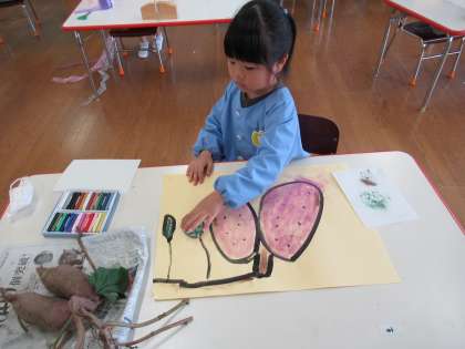 今日のつばめ組の様子 公開日 2021/10/18 更新日 2021/10/18 1日の生活 10月15日(金) 今日はサツマイモ堀りをしました。グループの友達と協力してツルを引っ張り、イモを掘りました。「あっイモ見えてきた」とサツマイモが見えるとサツマイモが折れないようにそっとイモの周りの土を掘り続けイモが抜けると「やったー」と喜ぶつばめ組さんでした。 掘ったイモをさっそく観察し絵で表現しました。コンテを使ってサツマイモの色を塗りました。素敵な作品に仕上がりました。