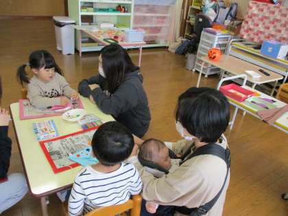 今日の親子サークルはハロウィンが近いので、お化けやカボチャのお面や、バックをつくりました。マジックで顔を描いたり、シールを貼ったりして素敵なハロウィングッズができました。つくった後は、幼稚園の中を魔女探しに出かけ、見つけた魔女さんからプレゼントをもらいました。