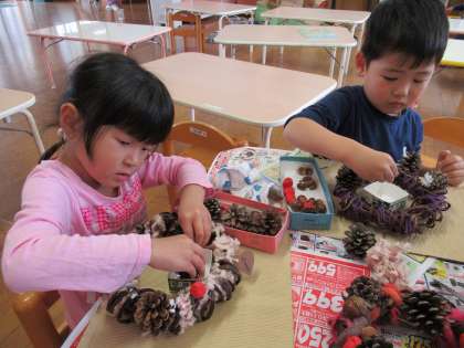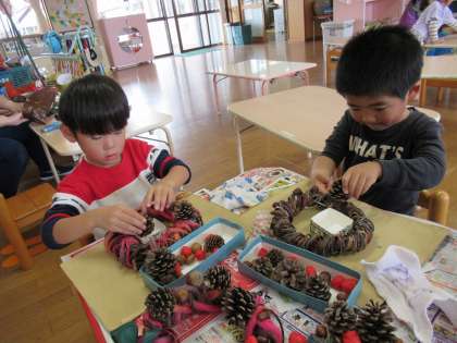 秋のリースをつくったよ(ほし組) 公開日 2021/10/28 更新日 2021/10/28 1日の生活 10月27日(水) 先日掘ったサツマイモのツルをリースにしたものが乾き、今日はみんなで拾ったドングリをボンドで飾り付けました。どこに付けようか悩みながら、真剣につくっている子供たち。まつぼっくりやフウの実も付け可愛く仕上がって嬉しそうにしていましたよ。