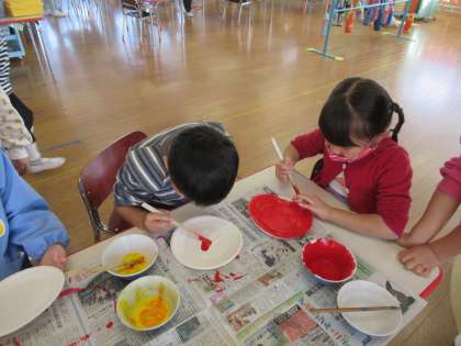 今日はクリスマスの製作をするため紙皿に絵の具で色を塗ったり、園庭で遊びました。天気がよく気持ちの良い日でした。