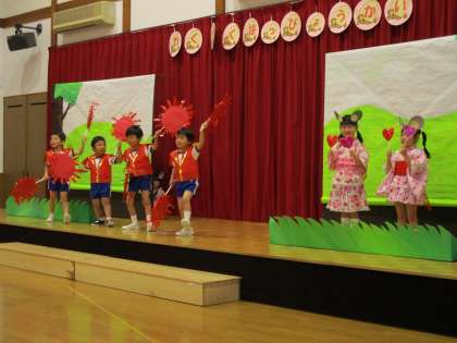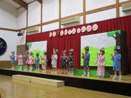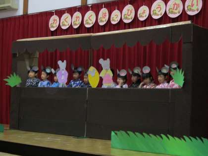 わくわく発表会がありました。2(たんぽぽ組) 公開日 2021/11/20 更新日 2021/11/20 1日の生活 プログラム3番は劇「ねずみの嫁入り」をしました。ペープサートを使ったり、男の子は途中で役を変わったりしながら少ない人数でもたくさんの役が登場し、楽しい劇になりました。子供たちは練習通り、大きな声で元気いっぱいに演じていました。