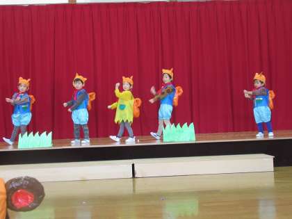 今日は、本番で披露した楽器や踊りのチームを交替して発表会ごっこをして遊びました。楽器が替わっても先生の真似っこを上手にしたり、友達が着ていた可愛い衣装を着て踊ったりしてとても嬉しそうな子供たちでした。