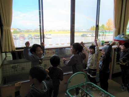 「雨が上がって晴れてきたね」と話していると窓に大きな虹を発見!「すごい!」「きれいだね」「大きいね」と大喜びの子供たち。ほし組にもきっといいことが起こりそうだねと話していました。