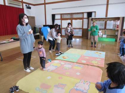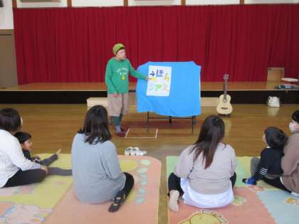 今日の親子サークルはゆきみだいふくさんを講師に迎え、パネルシアターを見たり、楽しい歌や踊りを踊ったりしました。パネルシアターでは美味しそうな食べ物が次々と動物に変化して大盛り上がりでした。最後は「まってますクリスマス」を踊り、サンタさんからどんなプレゼントをもらいたいかみんなで話しました。サンタさんから素敵なプレゼントが届くといいですね。