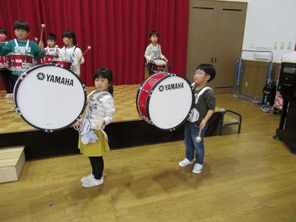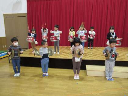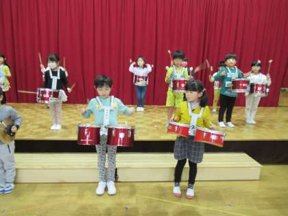 発表会と違う楽器を交代して遊びました。(つばめ組) 公開日 2021/12/01 更新日 2021/12/01 1日の生活 午後からやってみたい楽器を選んで楽しみました。友達のたたく様子をしっかり見ていたので、他の楽器もとても上手に鳴らしていました。