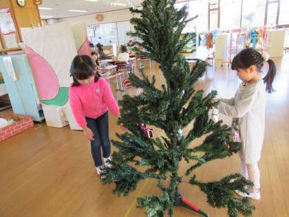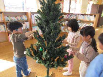 今日はクリスマスツリーに飾りを付けました。「おうちでも飾ったよ」と嬉しそうに話しながら飾っていました。
