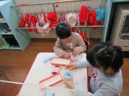 つばめ組ではマフラーづくりが始まりました。集中して取り組んでいます。出来上がると首に巻いて「もう少し長くする」と長さを確認しながらつくっています。