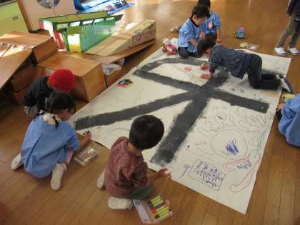 今日は、道路に昨日描いていたお店や家に加え、観覧車やプール教室等いろいろなものを描きました。午後からはトンネルや踏切をつくり「カンカン」と言いながら上げ下ろししていました。少しずつ賑わってきた街に「とやま」と名付けている子もいましたよ。