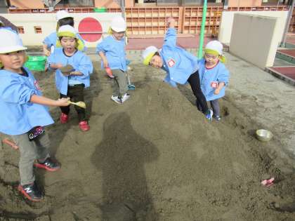 砂場では大きな山をつくる子や先日読んでもらった「ぞうさんのおとしあな」の絵本を思い出して落とし穴を掘る子もいました。大きな山、大きな穴ができました。とても力持ちのほし組さんです。