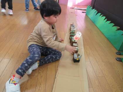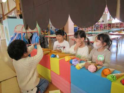 今日のたんぽぽ組の様子 公開日 2021/12/10 更新日 2021/12/10 1日の生活 12月10日(金) 今日はネズミの嫁入りごっこをしたり、先日オープンしたアイス屋さんでアイスを買って食べたりして遊びました。お店の前の新しい線路には、あの有名なキャラクターが乗る無限列車が何度も通っていましたよ。 ピーターパン広場では、“あーぶくたった”や“かくれんぼ”“虫探し”をして遊びました。