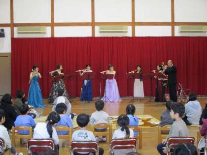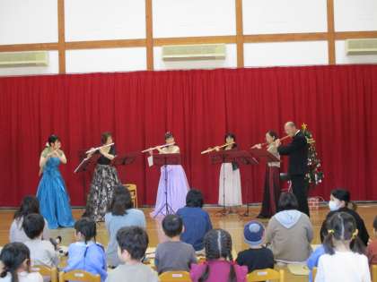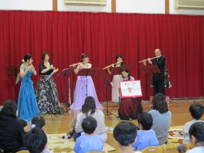 親子サークル 公開日 2021/12/15 更新日 2021/12/15 1日の生活 12月14日(火) 今日の親子サークルは、ひなたぼっこの皆さんのフルートアンサンブルでした。子供たちの好きな「紅蓮華」に始まり、ドラえもんの「虹」、クリスマスが近いので、フルートの音楽をバックに「ルドルフの大型絵本」「きよしこの夜」「小さな世界」などを演奏されました。子供たちは素敵なドレス姿に歓声をあげたり、知っている曲のときには一緒に歌ったりして楽しい時間を過ごしました。