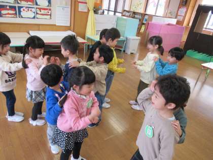 今日は体操教室の後にクラスで「はないちもんめ」や「貨物列車」の遊びをしました。ジャンケンをしてチームが増えていくことや、列車が長くなっていくことが楽しく、何度も繰り返し楽しみました。