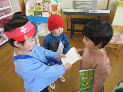 文字に興味をもってきたつばめ組さん。今日は、はがきの書き方を知らせ友達にお手紙を書きました。わからない文字があると、ひらがな表で確認しながら書いていました。お当番さんがポストに入っているはがきを各部屋に配りました。もらったお友達はとても嬉しそうでした。