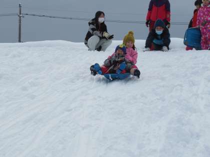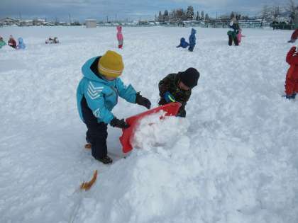 今日は天気が良く、たくさん雪遊びをして遊びました。ソリ滑りをしたり、雪だるまやかまくらをつくったりしました。かまくらは何度も雪を運んだり、ソリを使って集めてきたりしましたが、時間内に作り終えることができず、次の雪遊びまでのお楽しみにすることにしました。
