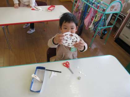 今日は雪だるまの壁面製作をしました。絵の具で雪だるまの顔の形を描いたり、切り紙をしたりしました。初めての切り紙は、見本を見ては「わー!すごい」と喜んだり、自分で切った切り紙を見て「こんな形になったよ」と嬉しそうに見せ合っていました。