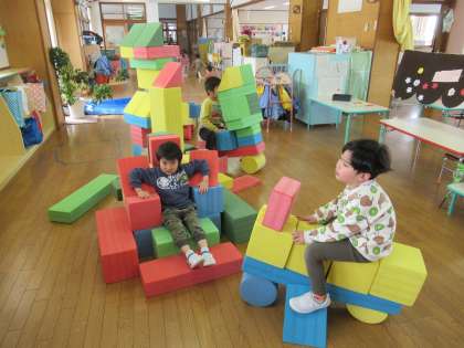 カラー積み木では大きな車や電車、飛行機をつくったり、警察署やパトカーをつくったり、王の家をつくり、王様になって立派な椅子に座って楽しんだりしていましたよ。