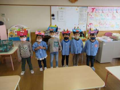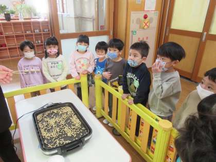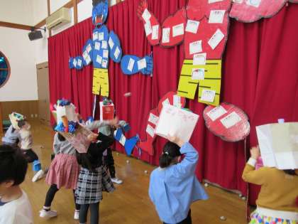 今日はクラスごとに豆まき集会をしました。節分の由来を聞いたり、どんな鬼を追い払いたいかをみんなの前で発表したりしました。プレイルームの鬼札が貼ってある大きな鬼に向かって「鬼は外!」と大きな声で豆(新聞ボール)まきをし、心の中の鬼を追い出そうと何度も豆をぶつけていましたよ。職員室の前からは、豆の炒っているいい匂いがしてきて、順番に見に行くと、園長先生が幼稚園に鬼が来ないようにと豆を炒ってくれていました。