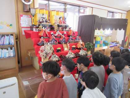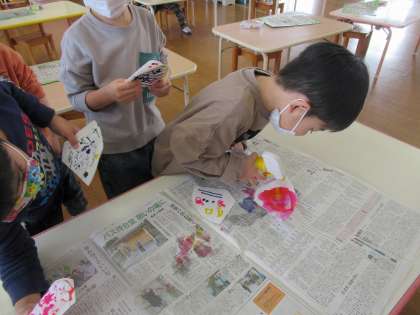 今日は本物のひな人形を見て、みんなで自分のひな人形をつくってみました。着物はコーヒーフィルターでにじみ絵をしました。にじむ様子に興味津々な子供たち。「素敵になったね」と嬉しそうでした。