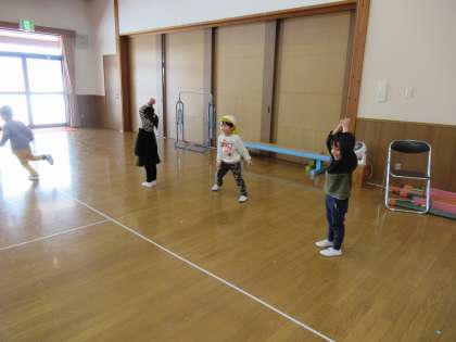 プレイルームではバナナ鬼をした後、みんなの提案でイチゴ鬼をしました。イチゴには皮がないので、どうしようかと話していると「(ヘタを)”ぶちっ”てしたらいいよ」と言う子がいてタッチされた子を助けるときは、イチゴのヘタを取ることにしました。何度か遊びましたが、鬼の子の足が速くて全員イチゴになり、イチゴ畑になった回もありました。