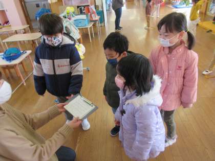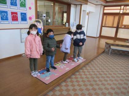 今日のたんぽぽ組の様子 公開日 2022/02/09 更新日 2022/02/09 1日の生活 2月9日(水) 今日からおはよう当番が始まり、嬉しそうに玄関に立ち、登園してきた友達に元気よく挨拶をしていました。つばめ組さんと一緒に各クラスのお休み調べの仕事も頑張っていましたよ。そして、つばめ組さんの修了式の練習にも参加しました。静かに様子を見たり、お別れの言葉や歌を一緒にしたりして初めて修了式の雰囲気を体験することができました。