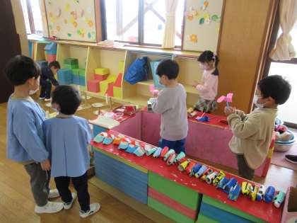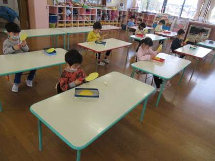 今日はたんぽぽの製作をしたり、お店屋さんで遊んだりしました。たんぽぽ製作では丸い画用紙に切り込みを入れて重ねてつくりました。