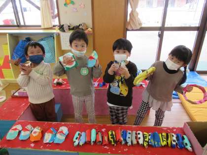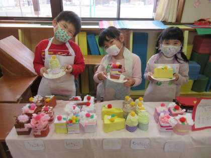今日も登園してすぐにお店屋さんに行き、楽しんでいた子供たちです。今日はお店屋さんの商品を紹介します。
