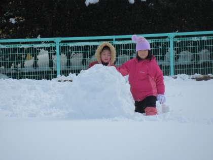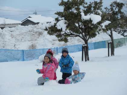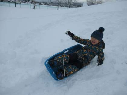 今日は雪遊びをしました。ソリをしたり大きな雪の玉をでつくったりして遊びました。雪玉をつくるのに適した雪質で子供だけでも大きな雪玉をつくることができました。